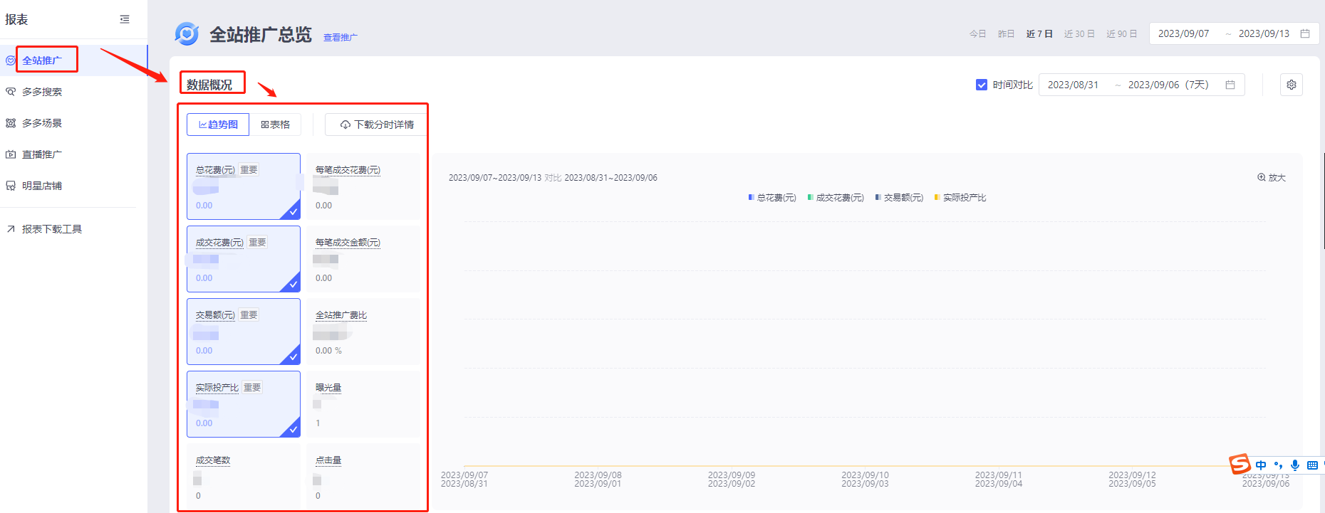 用于采集 拼多多-推广平台-报表-全站推广-数据概况 下的界面数据。