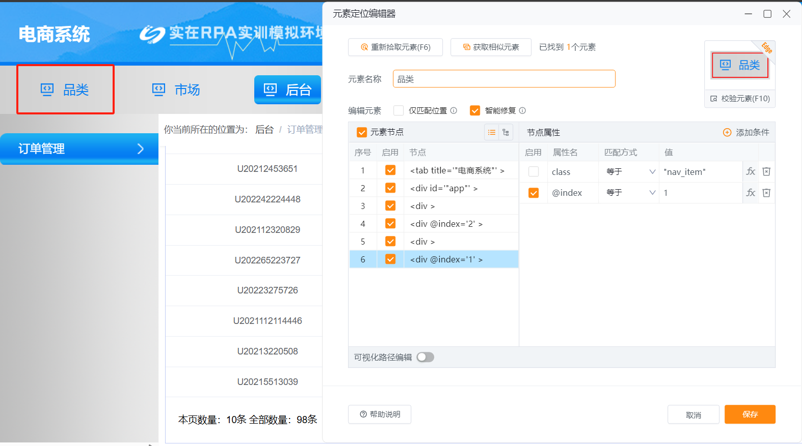 在实在智能实训平台上,捕获到了”品类“按钮,现在要对改按钮元素进行编辑,使之可以校验到”市场“按钮,以下操作正确的是?