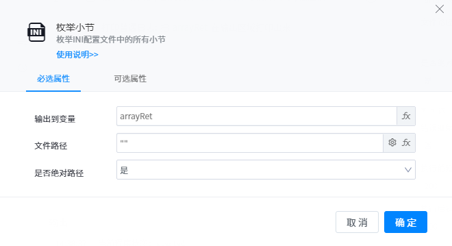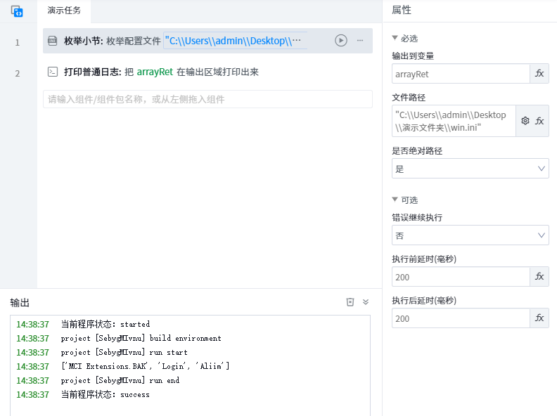 Example: get all sections of the local win.ini file and print it as a log. After running, you will see all sections of the file at the log output.