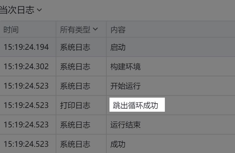 成功跳出循环,并运行下一个组件,在输出栏中输出“跳出循环成功”。