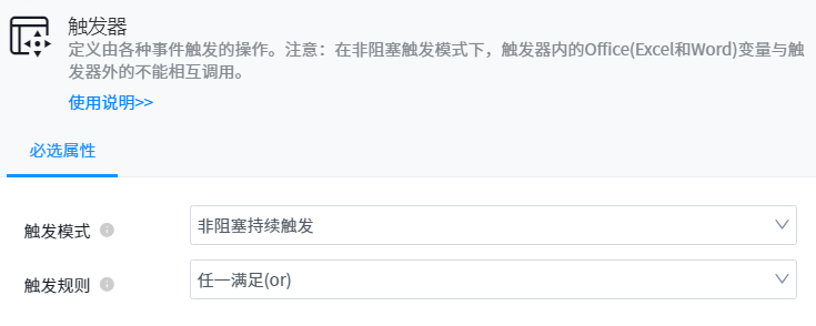 Select "non blocking trigger once": trigger once when the trigger conditions are met, which does not affect the subsequent process operation. c) If "block trigger once" is selected, it will be triggered once when the trigger conditions are met, blocking the operation of subsequent processes.
