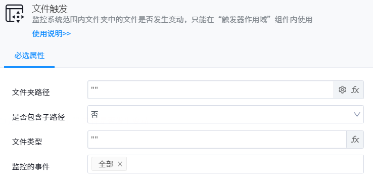 After adding a file trigger component to the visual editing area in the trigger scope, click & ldquo; Select Folder & rdquo; For the folders to be monitored, you can also set the & ldquo; attribute on the right; Folder path & rdquo;, You can also set & ldquo; Monitored events & rdquo;, And & ldquo; File type & rdquo;.