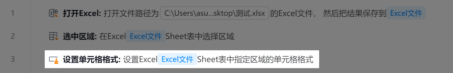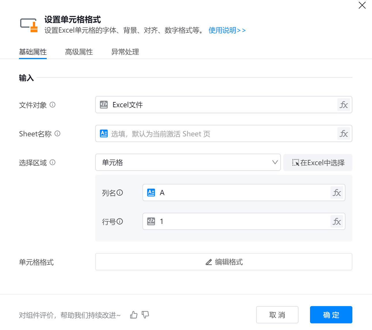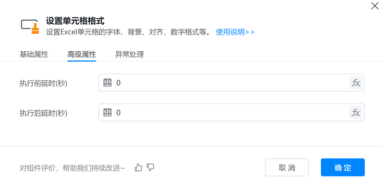 组件用于调整Excel中指定单元格或区域的数据显示样式,包括数字格式、字体、边框、填充颜色等属性。