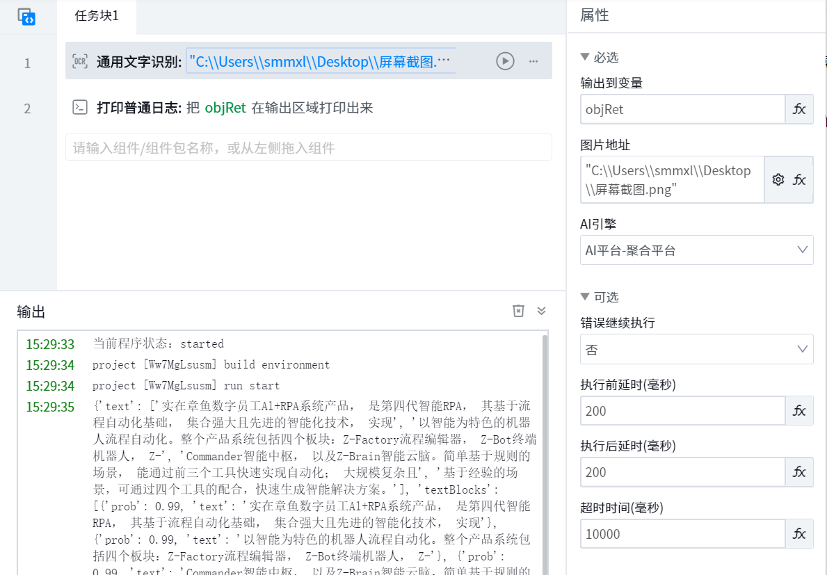 ● output to variable:The obtained PID of the executing application needs to be output and assigned variables.