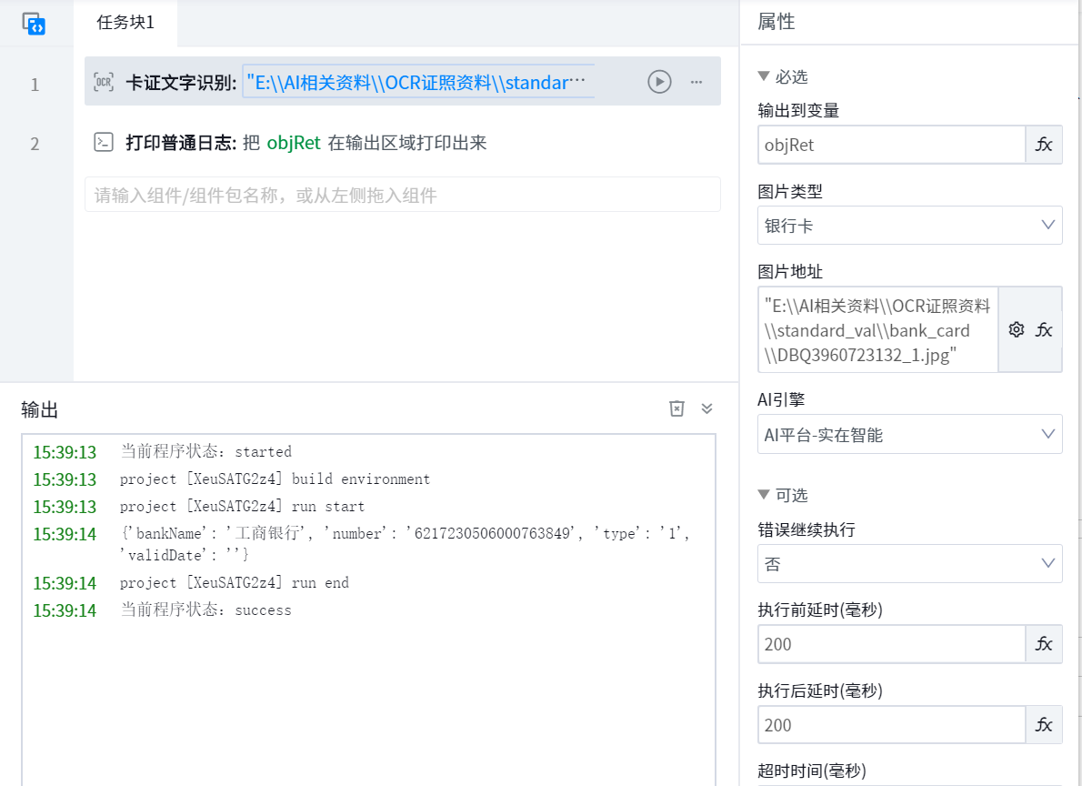 The information in the target card is automatically identified through OCR, and the extracted information is output to the specified variables in the form of structured fields.