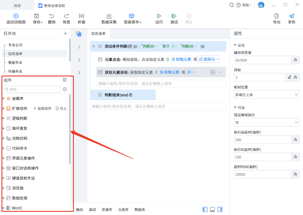 ⽐ for example, opening browser, data format conversion, figure ⽚ OCR recognition, etc. are all components. A process block contains multiple components. When editing and designing the details of a process block in the z-factory robot process editor, a large number of components are built in. The calling of components can be realized by dragging and dropping components; The setting of component attributes and the definition of input and output realize the setting of components in business.