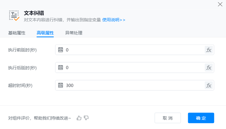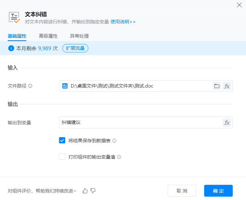 ● 文件路径:需要被识别并纠错的文件路径,可以点击右侧“小文件夹按钮”手动选择文件夹或者点击”fx“选择已保存的文件夹变量。