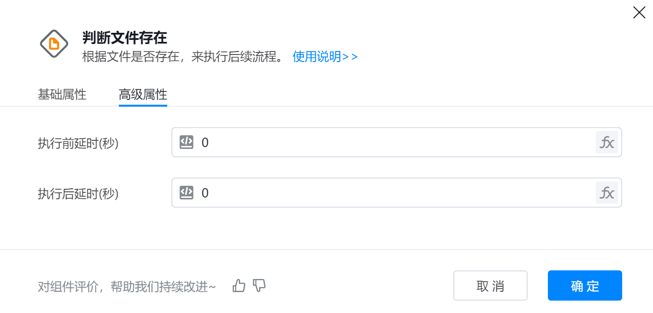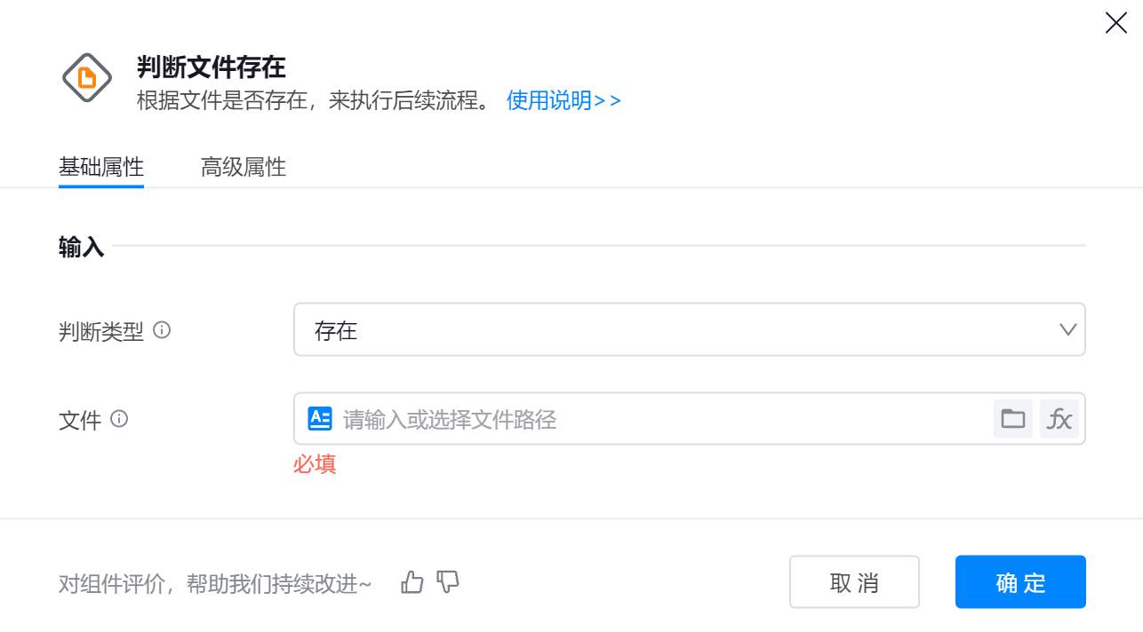 组件用于检查指定路径下的文件是否存在,以便决定后续文件操作的执行路径。