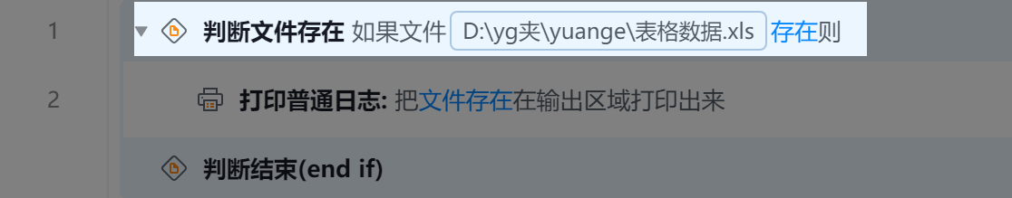 判断是否有“表格数据.xlsx”文件的存在,存在则在输出区域打印存在文件。