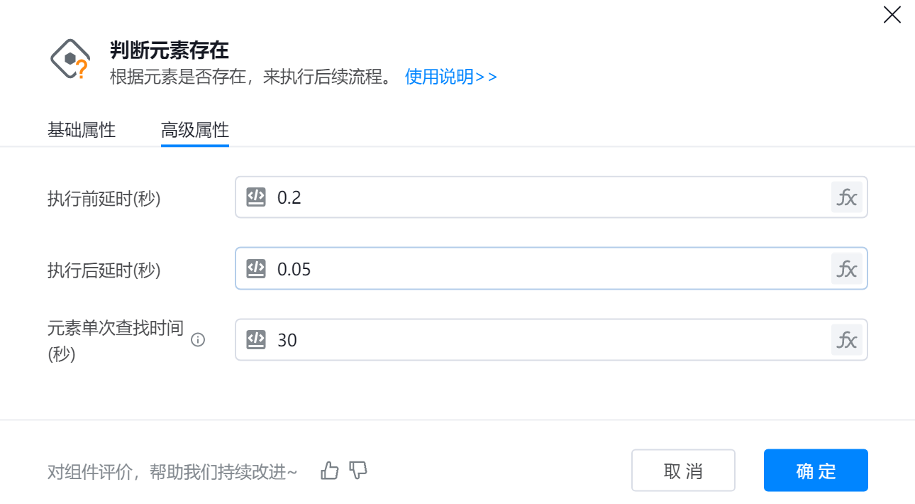 ● 判断类型:判断目标元素的状态,可选择存在/不存在(存在指目标元素在指定界面上已被成功识别,不存在指目标元素未找到或无法识别)
