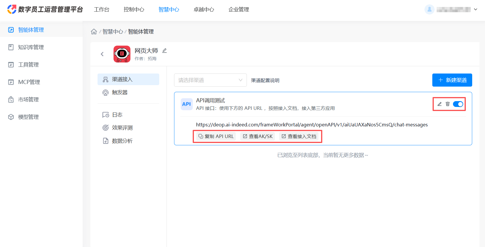 选择创建API接入渠道后,可以通过调用 OpenAPI 的方式使用智能体服务。