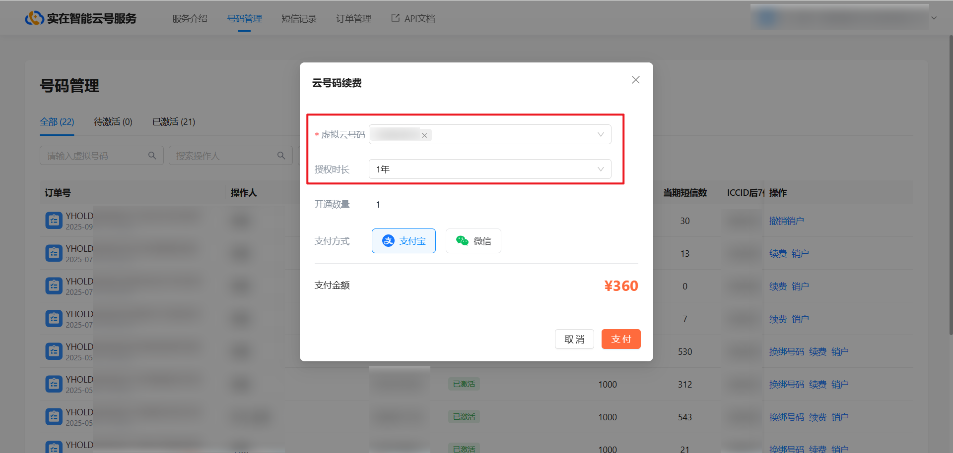 - 在订单管理页面中,可查看在线购买虚拟云号的全部订单