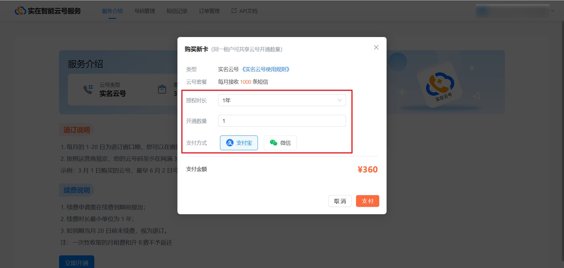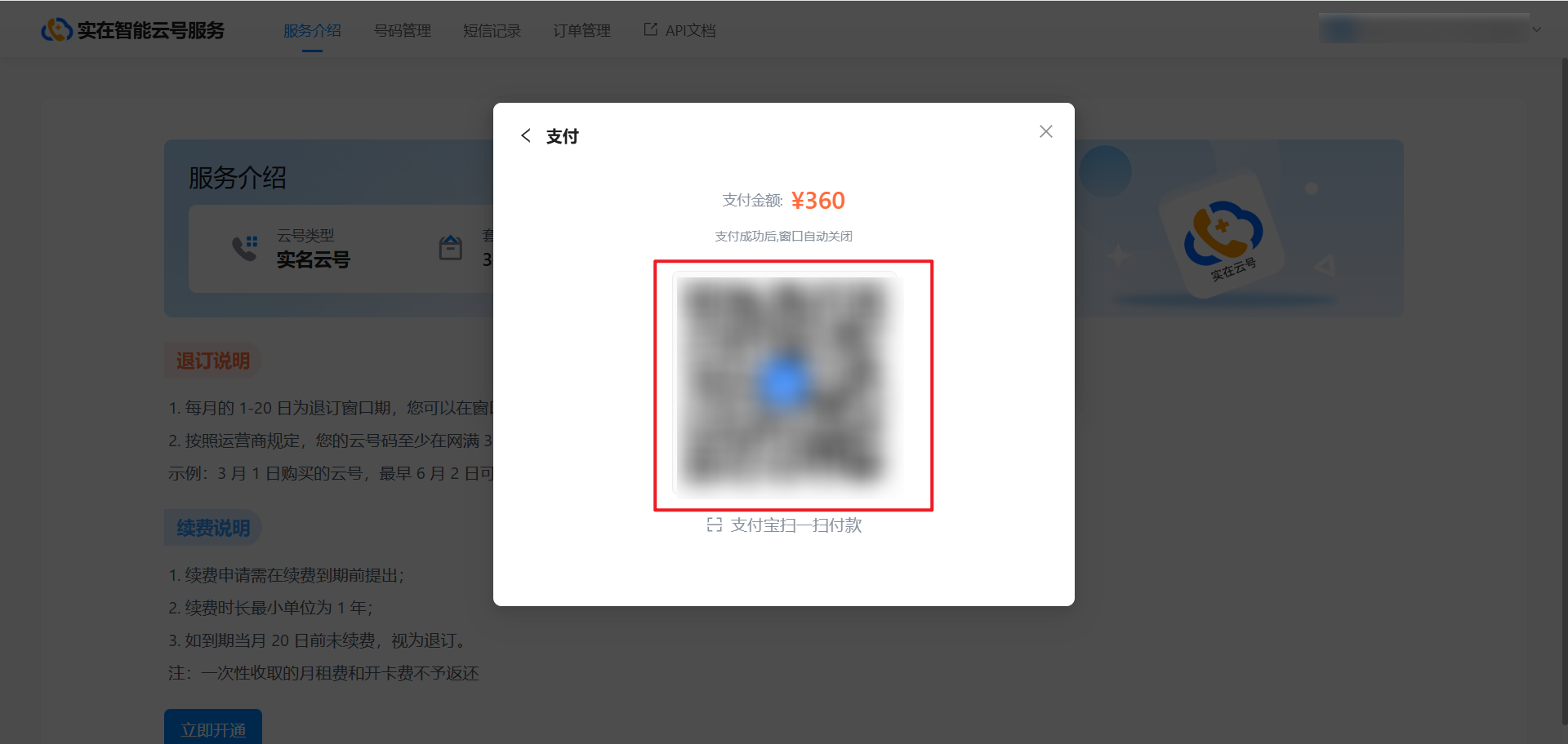 - 选择虚拟云号码、授权时长、支付方式,点击“支付”,支付成功即完成续费