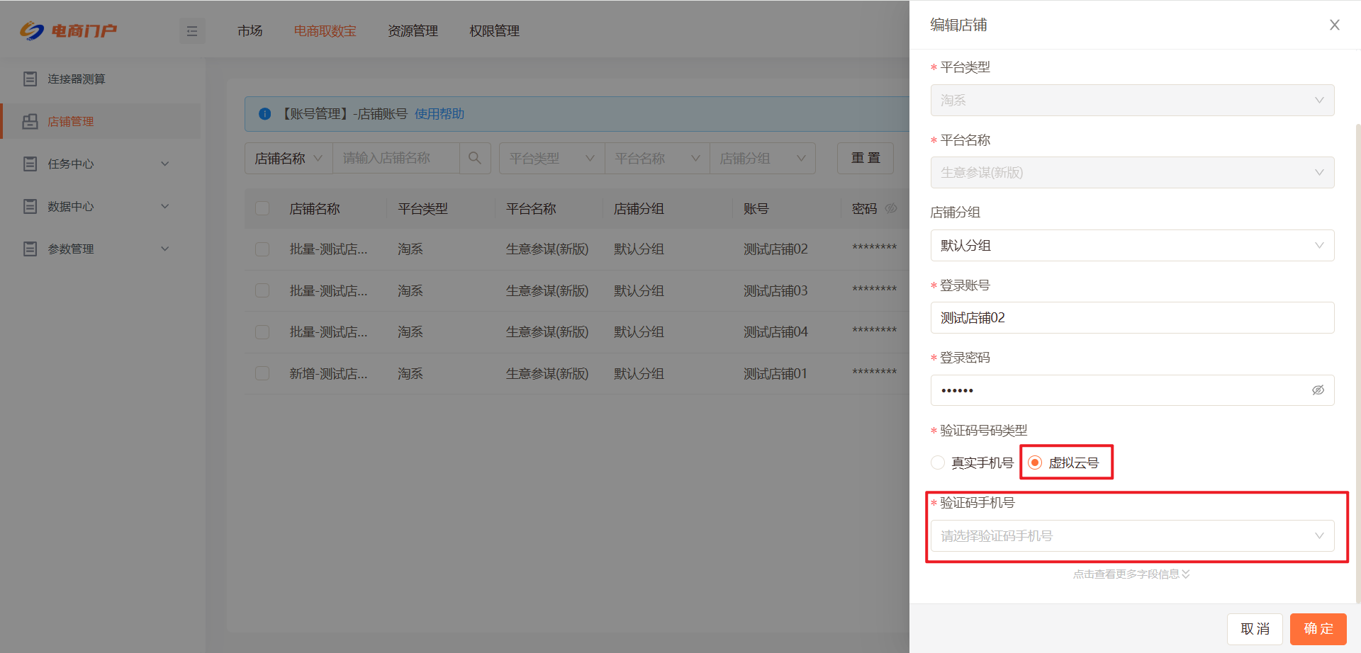 - 在取数宝店铺管理页面中,店铺的验证码号码类型可选择虚拟云号,并填写对应的虚拟号码,短信验证码将由云号接收获取