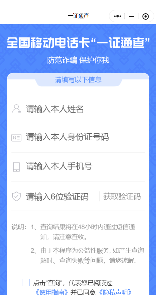 点击“移动电话卡”,填写个人信息即可查询身份证下已开通电话卡数量。