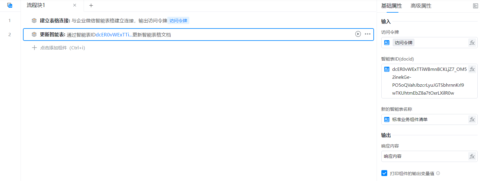 该流程需要使用【企业微信智能表格-建立表格连接】组件来获取访问令牌-access_token(关于该组件的具体使用详情可参考其使用文档)