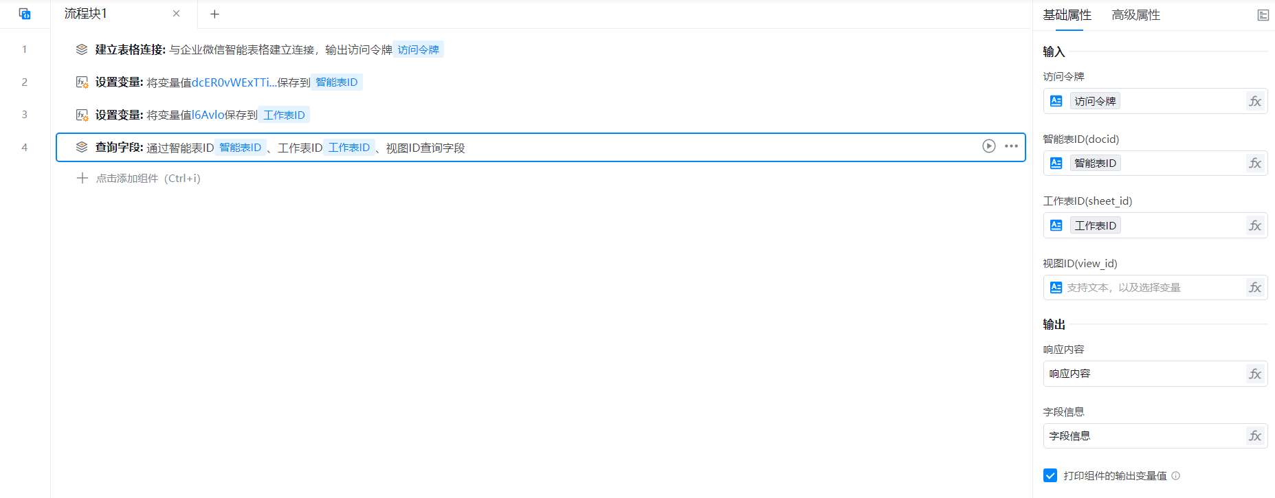 该流程需要使用【企业微信智能表格-建立表格连接】组件来获取访问令牌-access_token(关于该组件的具体使用详情可参考其使用文档)