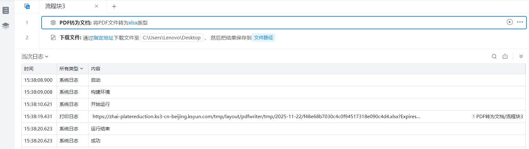 WPS在线格式转换-PDF转为文档,将PDF文件转为xlsx格式文件后下载至本地,并将执行结果输出至控制台。