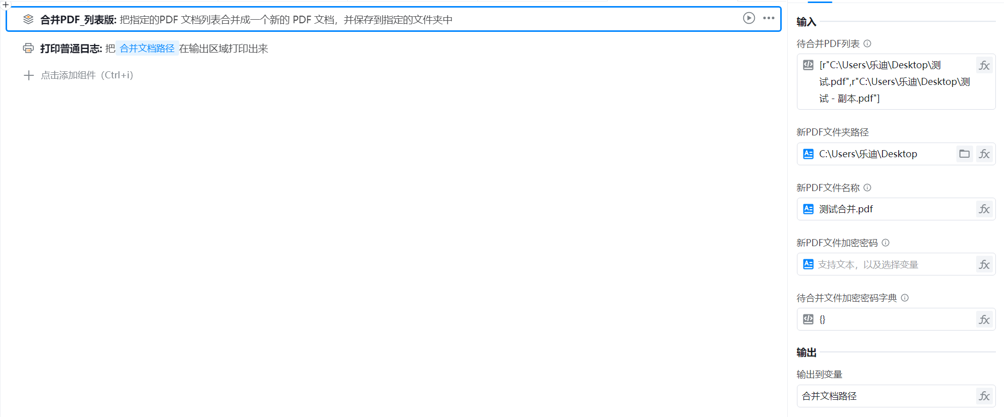 - 新PDF文件名称:字符串类型 , 填写合并后的PDF文件名称 , 需带后缀".pdf"
