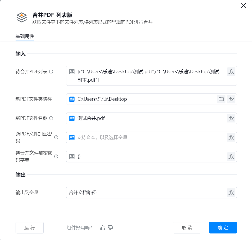 - 待合并PDF列表:列表类型,填写需合并的PDF列表项 , 支持已变量的形式填入