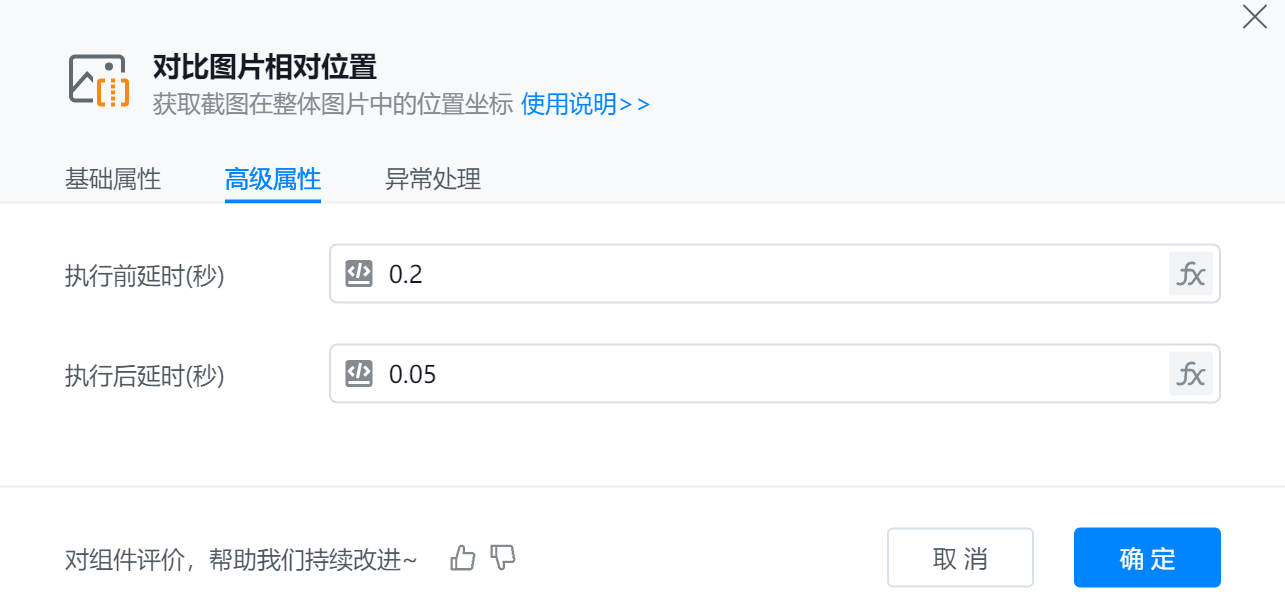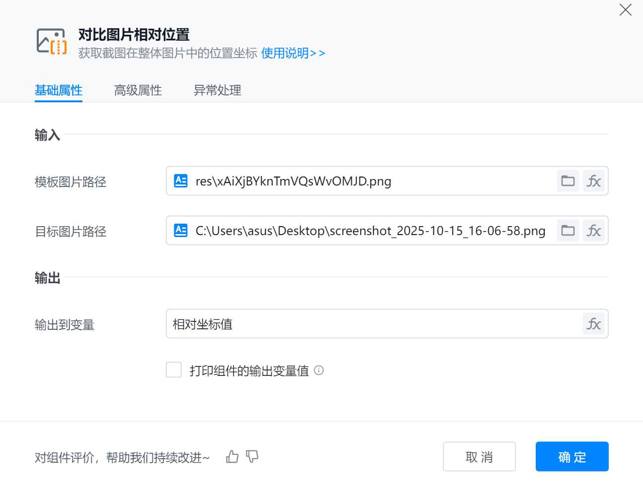 添加【对比图片相对位置】组件到可视化编辑区,将目标图片与模板图片进行相对位置对比并输出。