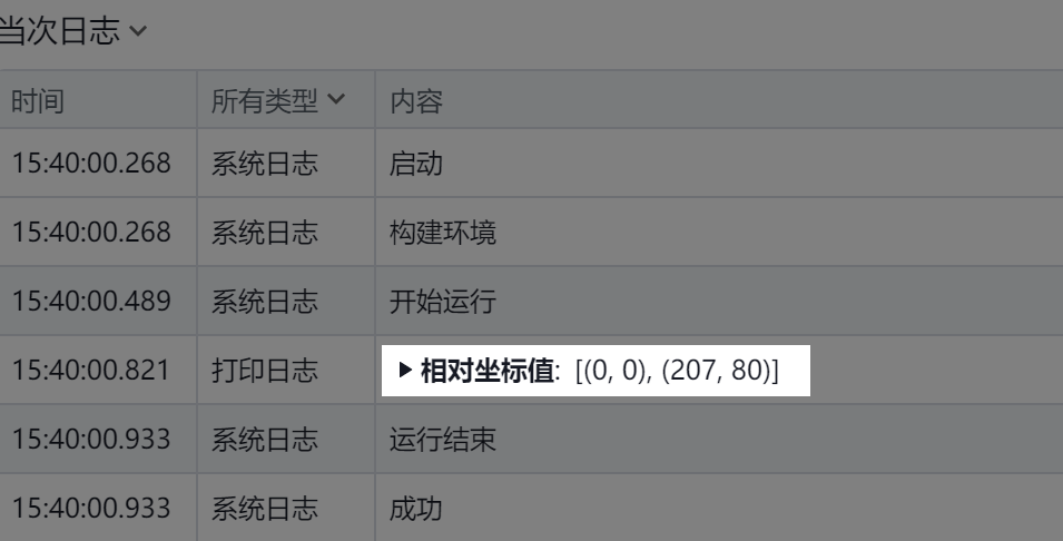 在输出区域打印“相对坐标值:[(0, 0), (207, 80)]”。
