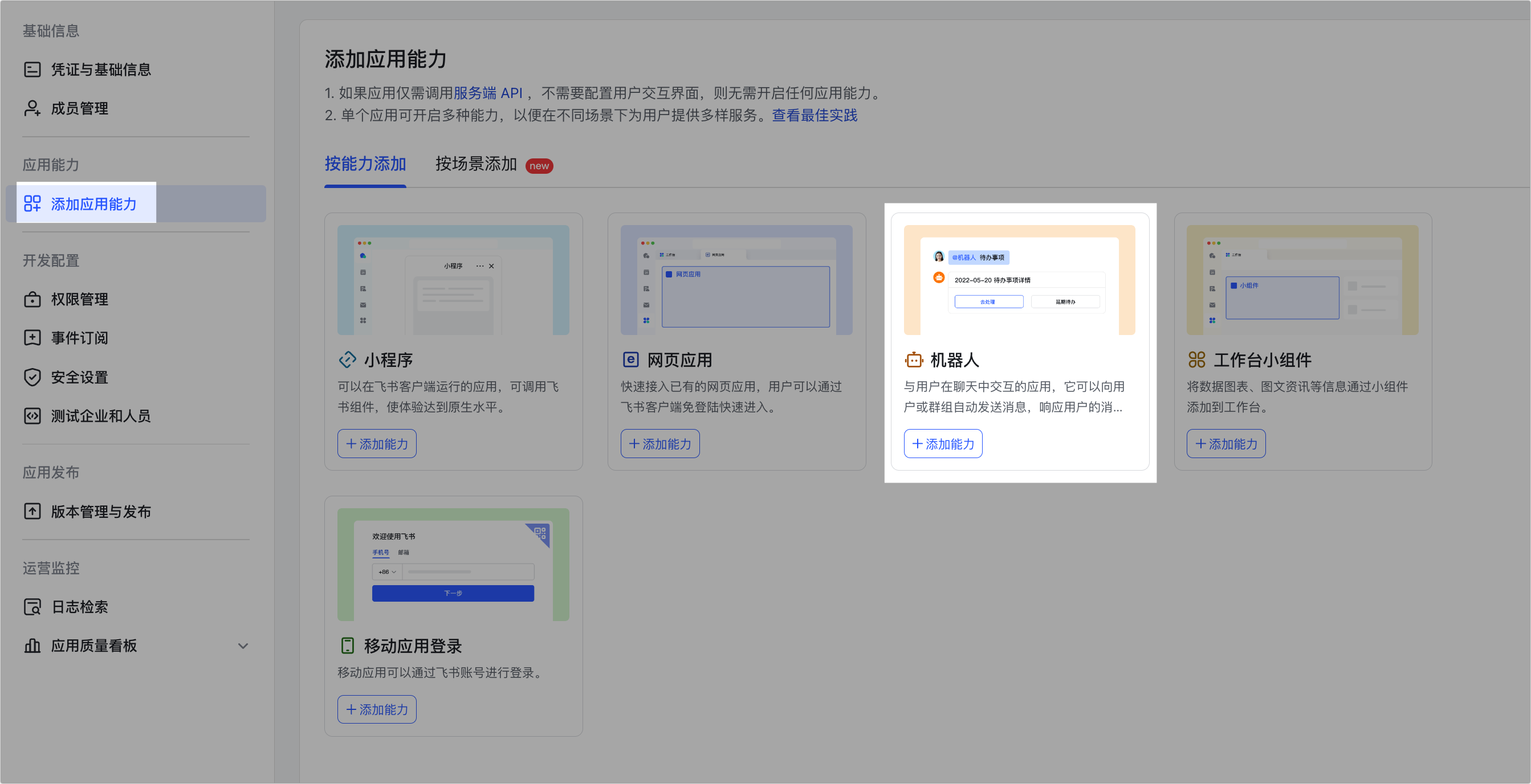 1、创建内部飞书应用;2、应用开通相关操作权限;3、创建内部机器人应用;4、添加机器人应用至飞书群聊;5、获取appID、appSecret