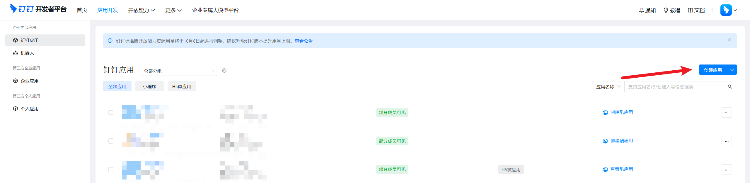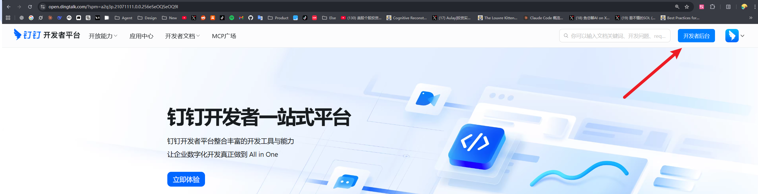 使用具备管理员权限的钉钉账号,访问钉钉开发者平台。若无管理员权限,自行创建一个组织即可