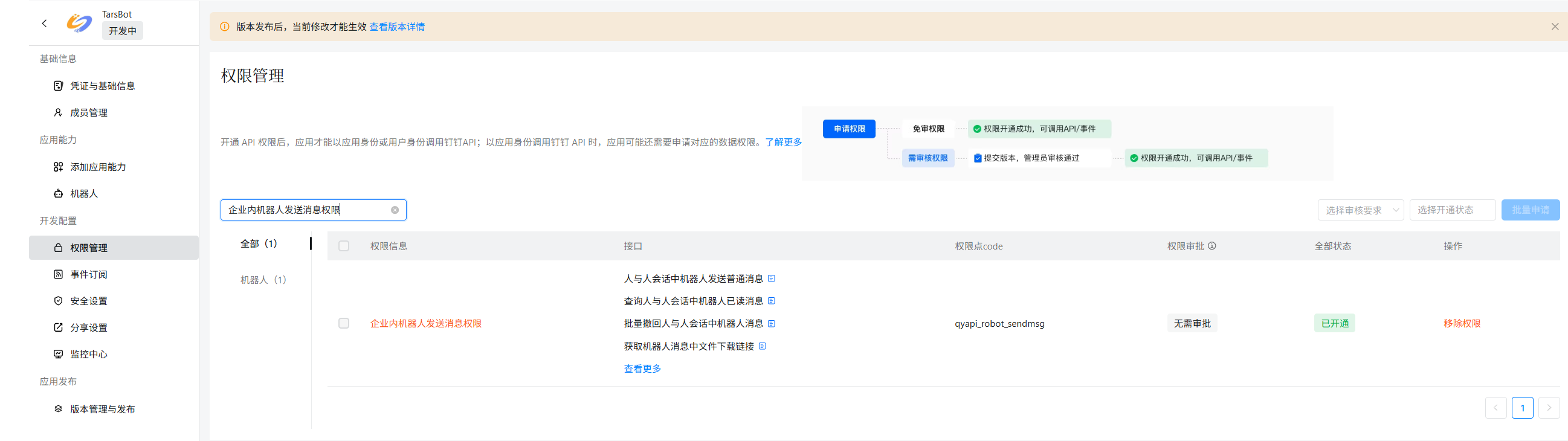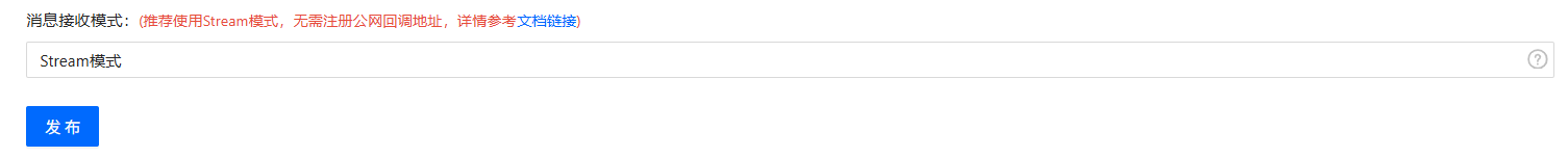 开启机器人配置,填写必要信息,消息接收模式选择stream模式,并发布