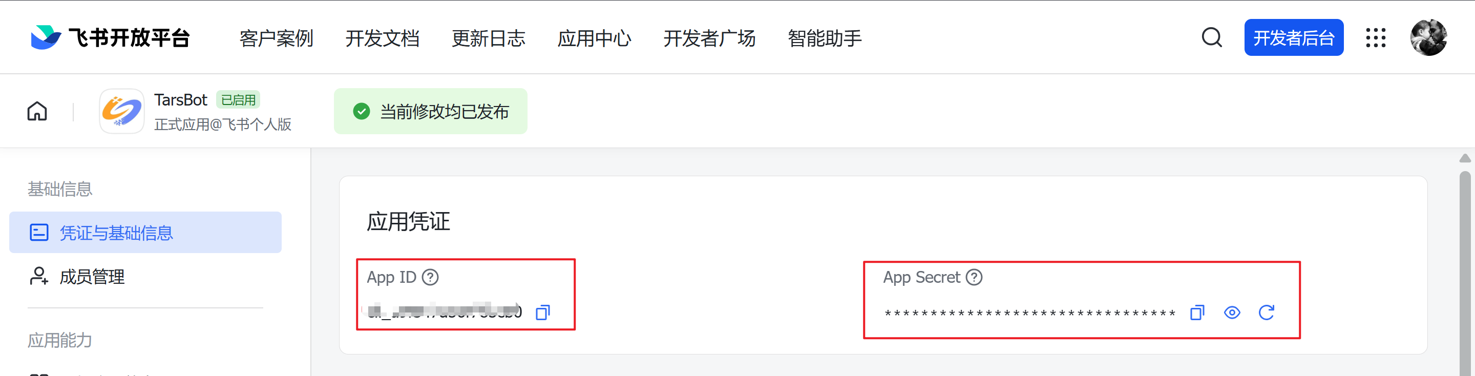 在已创建应用的「凭证与基础信息」中,获取 Client ID 和 Client Secret