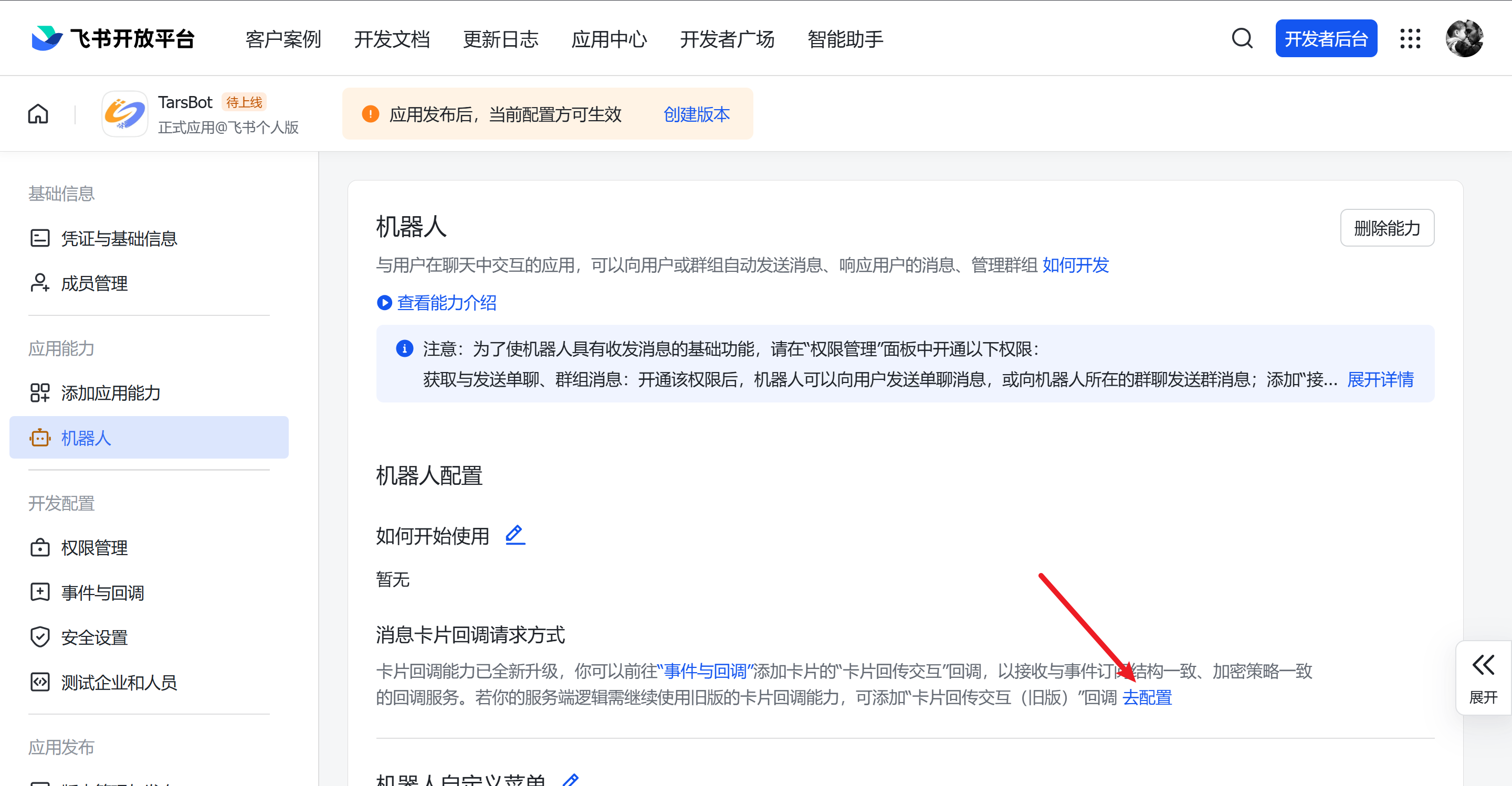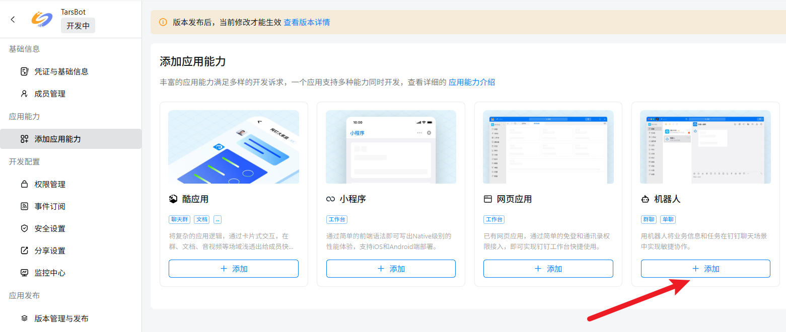 在「添加应用能力」中,添加「机器人」能力。并对机器人配置进行如下设置: