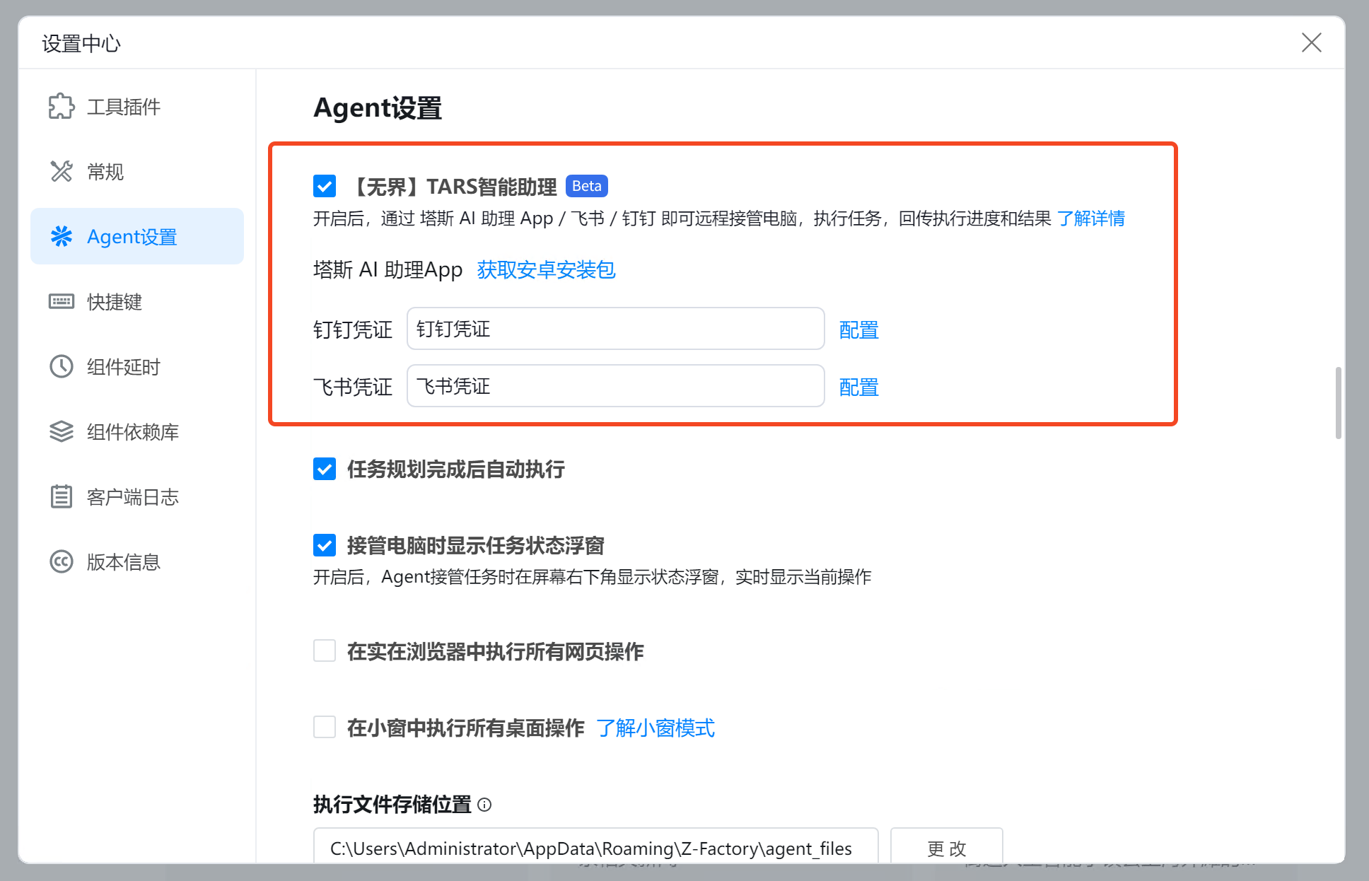 打开实在 Agent 客户端 -> 设置中心 -> Agent 设置,勾选以启用 【无界】TARS 智能助理,点击「飞书凭证」的“配置”选项,填入应用凭证中获取的对应 App ID 与 App Secret