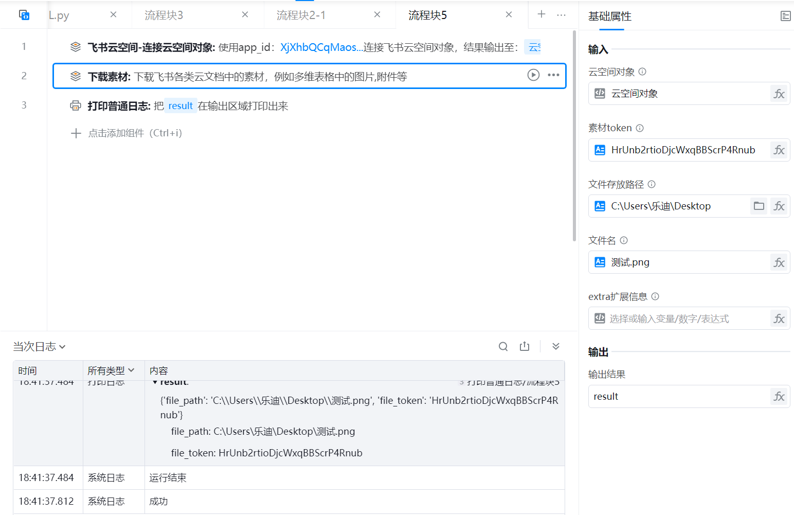实例描述:飞书云空间-下载素材,下载飞书多维表中的“飞书API测试.jpg”图片,并打印输出结果至控制台中。