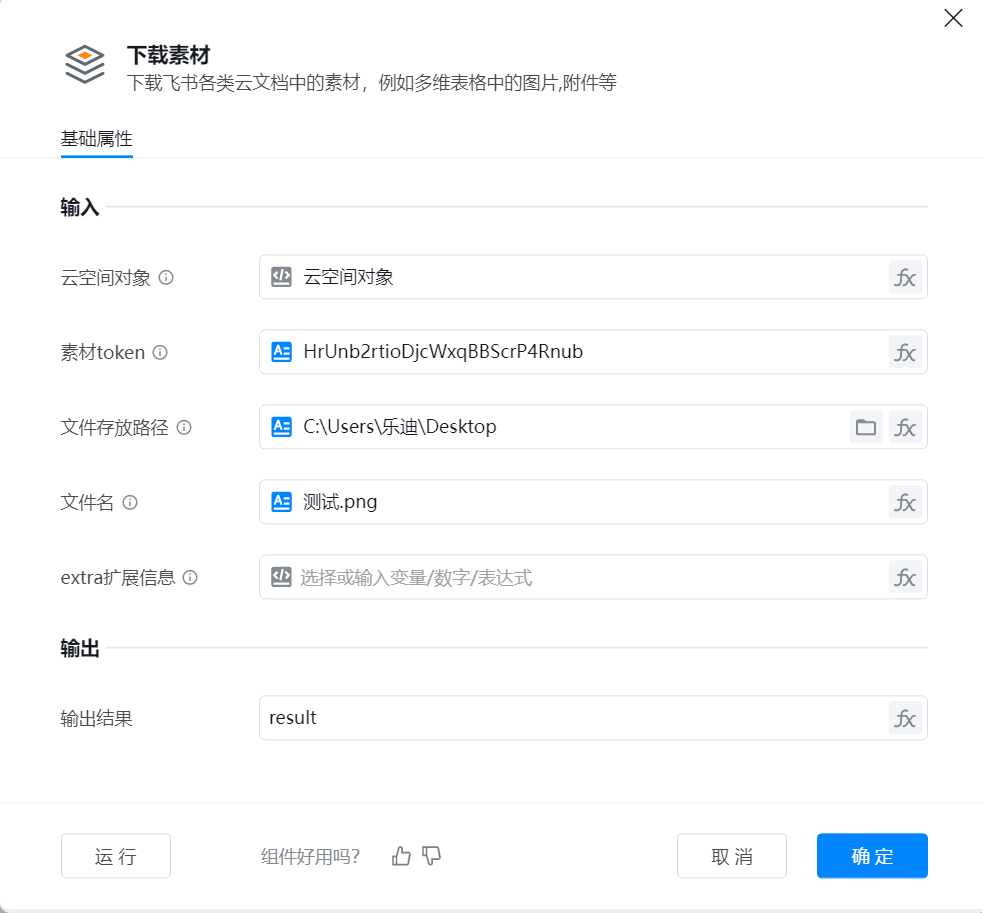 - 云空间对象:字典;可使用【飞书云空间-连接云空间对象】组件获取