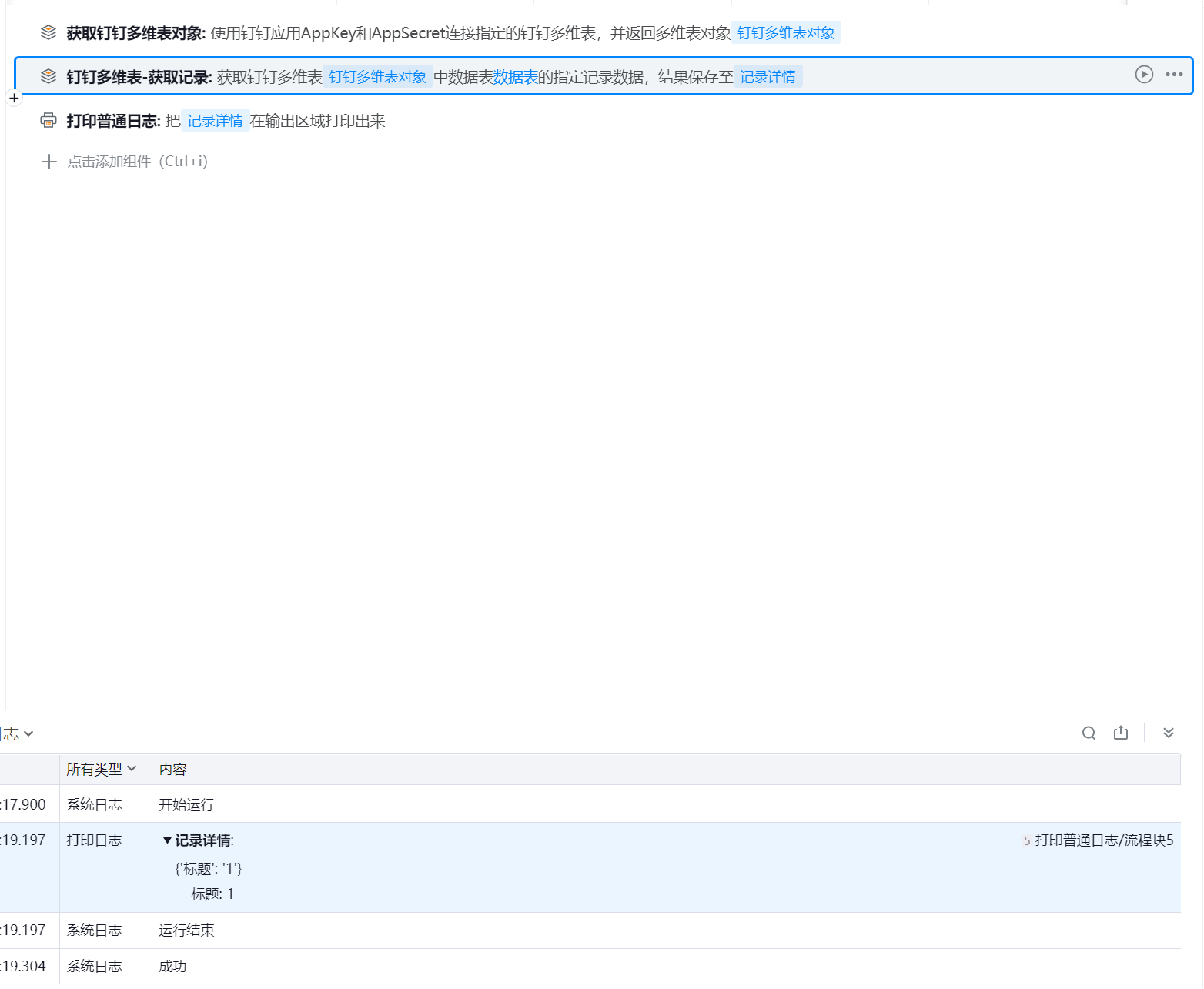 该流程需要使用"钉钉多维表-获取钉钉多维表对象"组件来获取钉钉多维表对象。(关于该组件的具体使用详情可参考其使用文档)