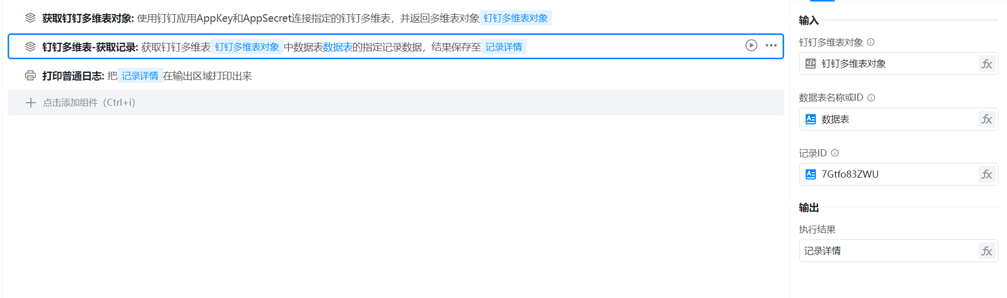 - 记录ID:字符串类型; 填写需获取信息的指定记录ID,可使用 [钉钉多维表-获取多行记录] 组件进行获取