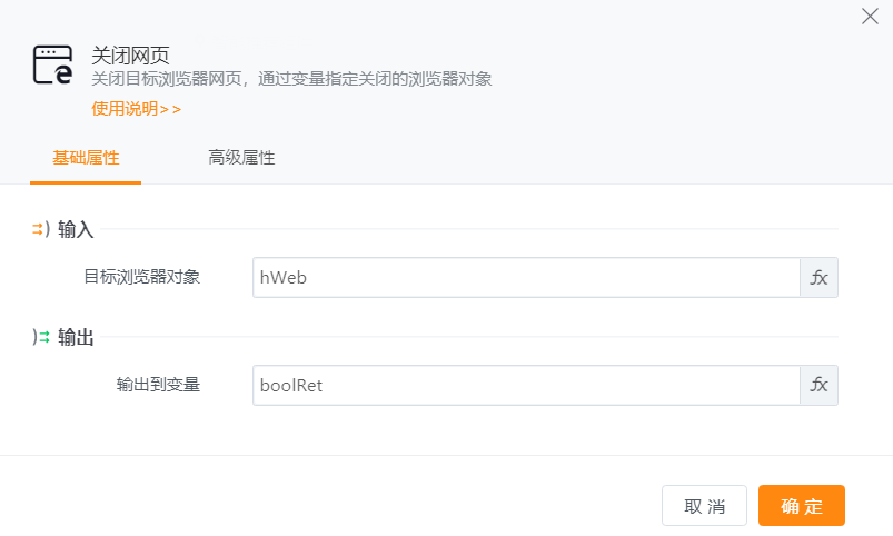 ● 输出到变量:是否成功关闭当前网页。如果成功关闭当前网页,返回变量的值为true;若关闭当前网页失败,返回变量的值为false。