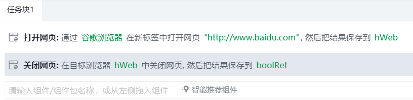 打开百度首页后,运行“关闭网页”组件,将此网页关闭。