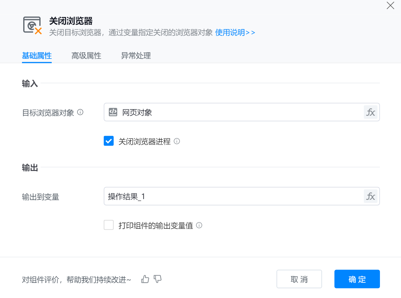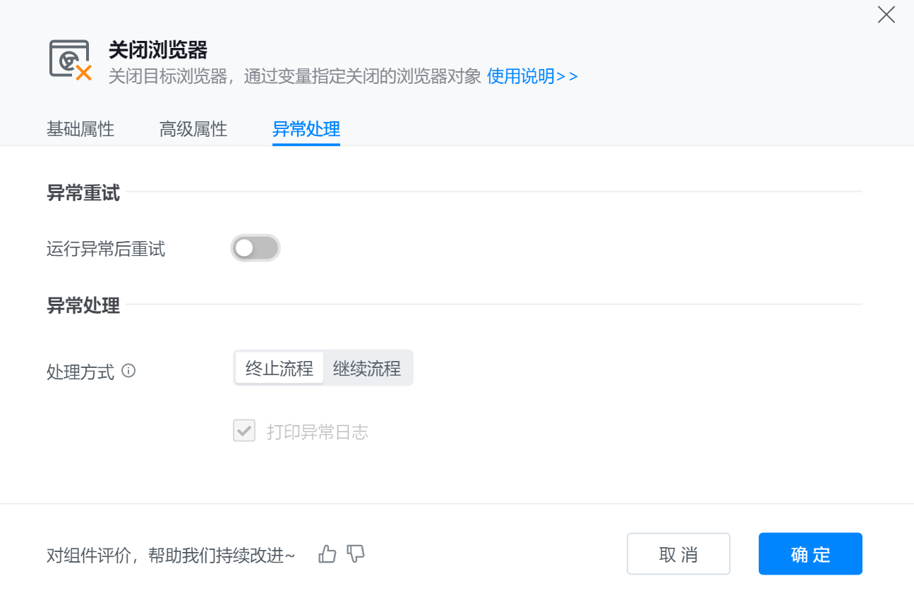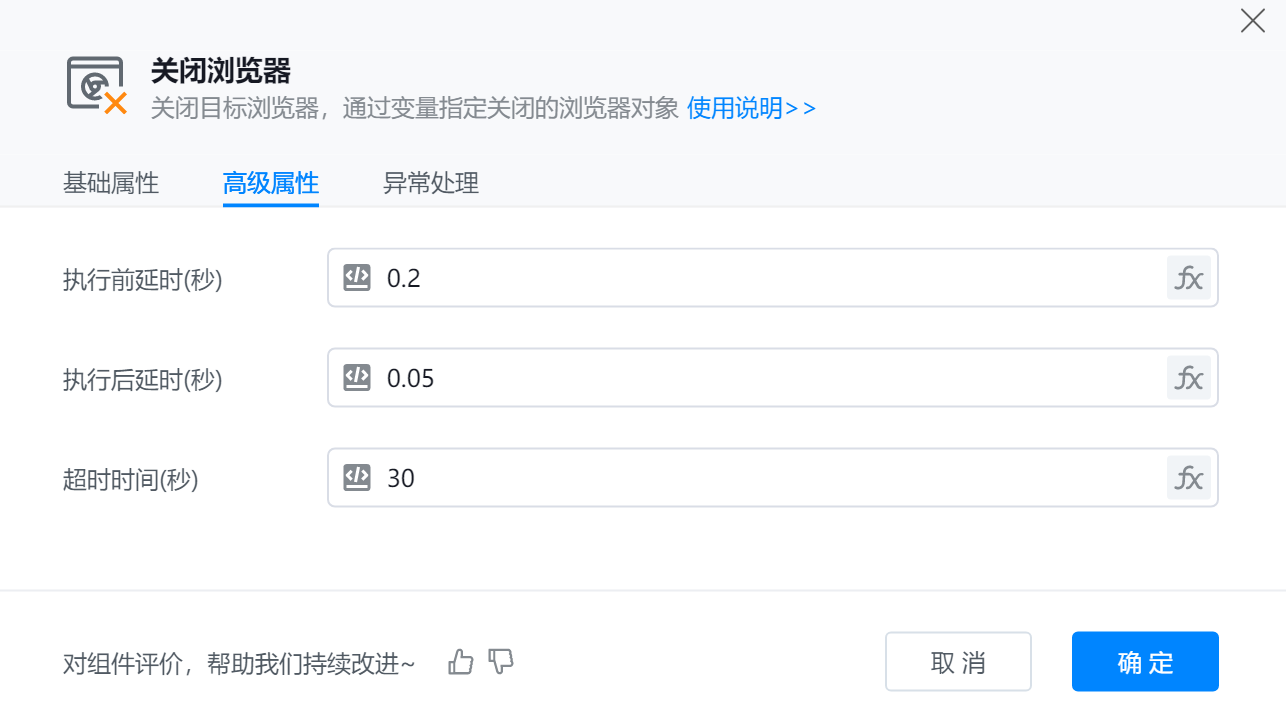 ● 输出到变量:表示将浏览器关闭操作的结果或状态保存到指定变量中,以便后续程序使用或判断执行情况。