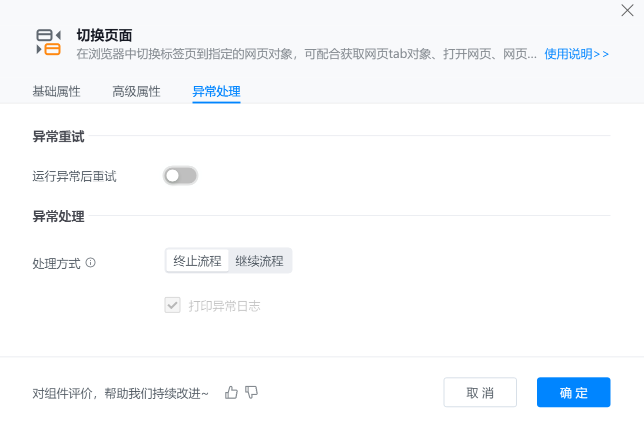 ● 异常重试:当流程运行过程中发生异常时,可根据实际需求配置是否启用重试逻辑。