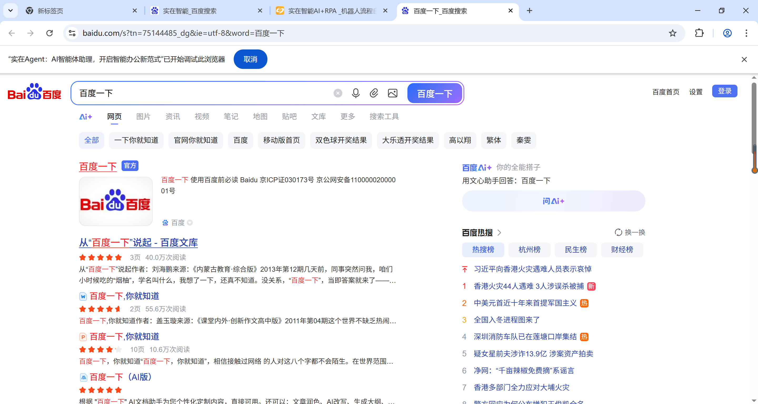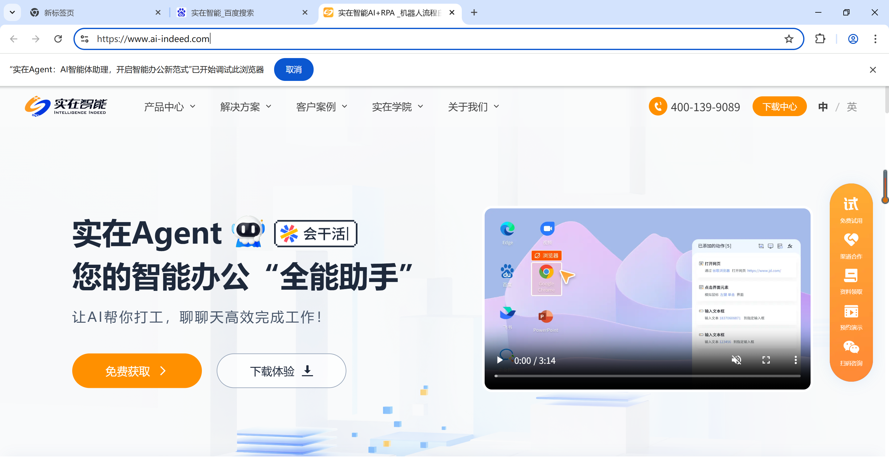 在谷歌浏览器,打开百度首页和实在智能官网首页,运行组件,切换至百度首页并激活。