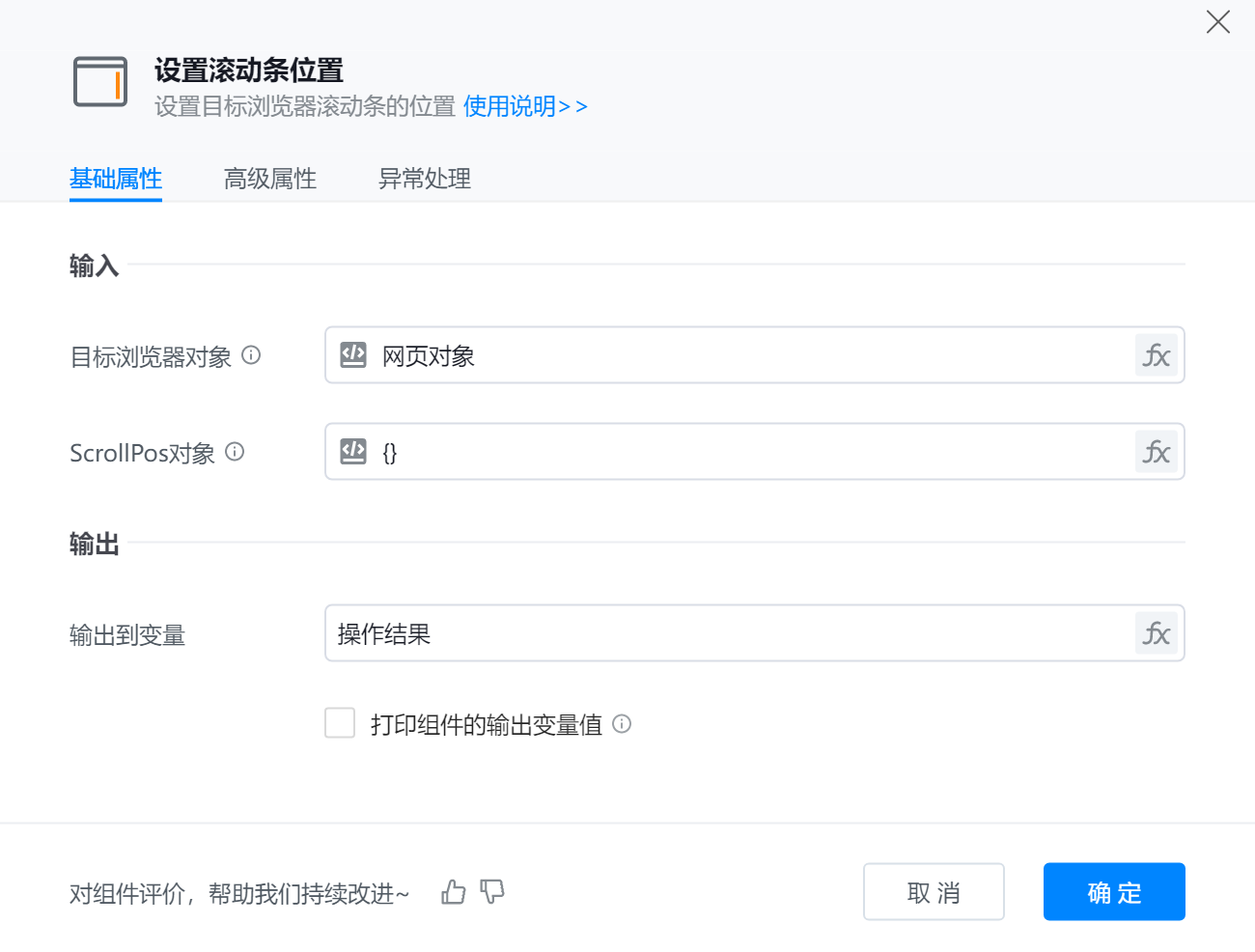 ● ScrollPos对象:将滚动条移动到指定位置。ScrollTop:表示纵轴滚动条的位置;ScrollLeft:表示横轴滚动条的位置。示例:{'scrollTop':'342','scrollLeft':'20'}