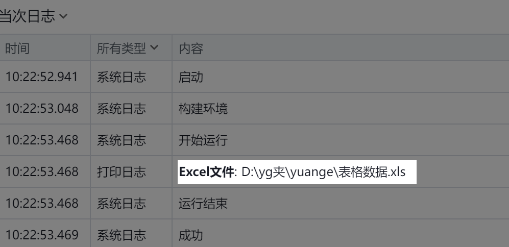 打开指定的Excel文件成功,在输出区域打印“Excel文件:D:\yg夹\yuange\表格数据.xls”。