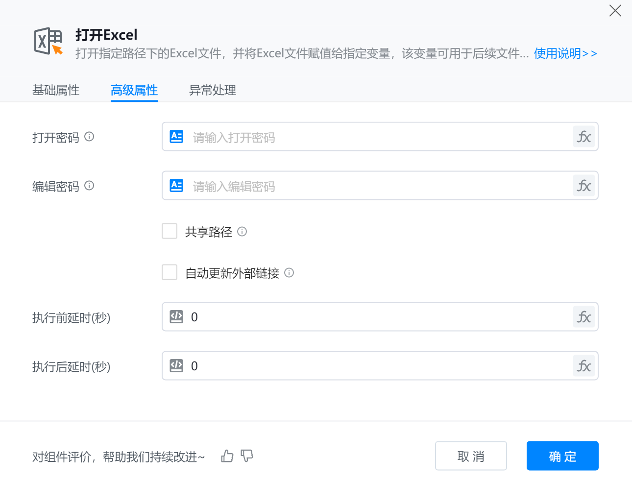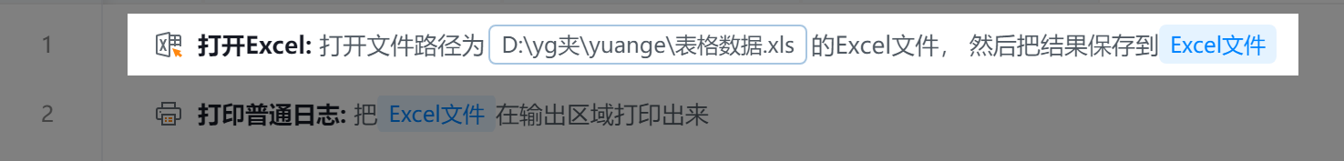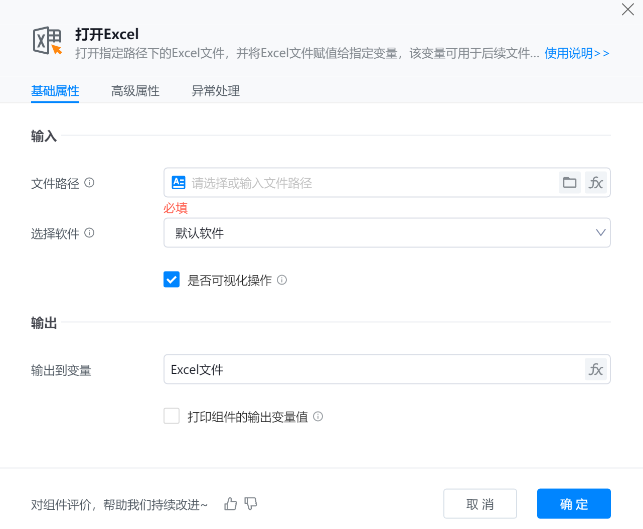 组件用于打开指定路径下的Excel文件,并将文件赋值到指定变量。该变量可用于后续文件的读取、编辑等操作。