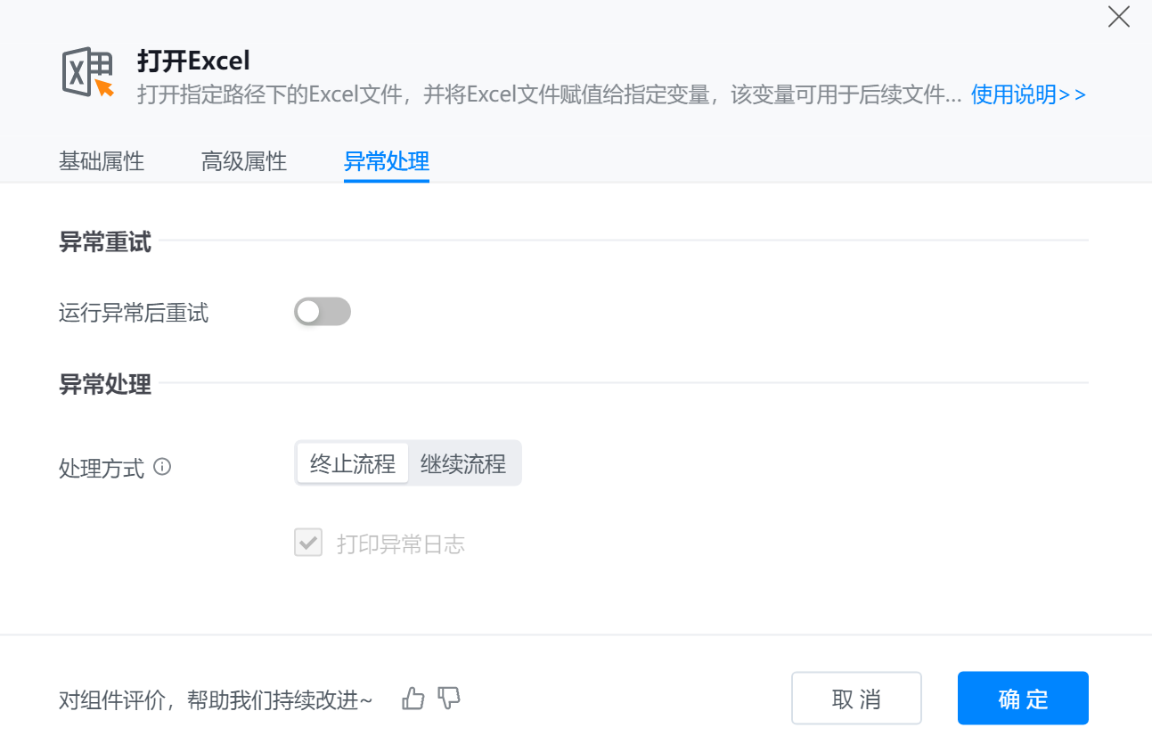 ● 异常重试:当流程运行过程中发生异常时,可根据实际需求配置是否启用重试逻辑。