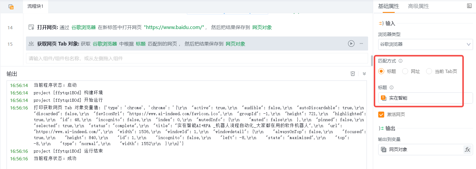 获取浏览器中根据标题或网址匹配的Tab页,也可获取当前网页,并输出到指定变量。