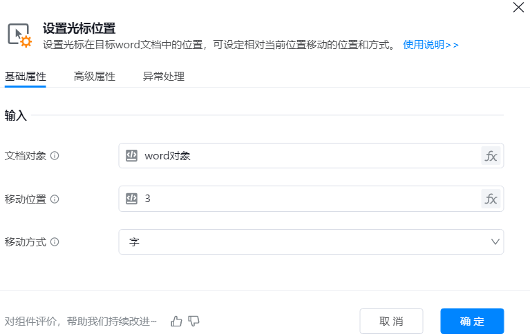● 文档对象:代表要操作的Word文档对象,可以使用打开文档等组件返回的变量。