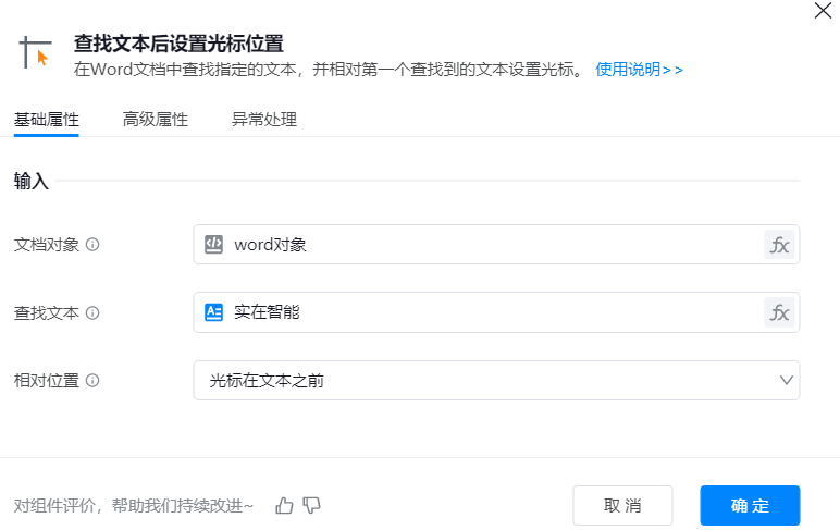 2. 添加此组件并查找“实在智能”,设置光标在文本之前。