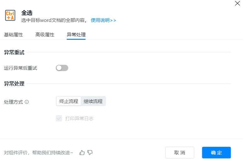 ● 异常重试:当流程运行过程中发生异常时,可根据实际需求配置是否启用重试逻辑。