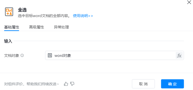 ● 文档对象:代表要操作的Word文档对象,可以使用打开文档等组件中获得。